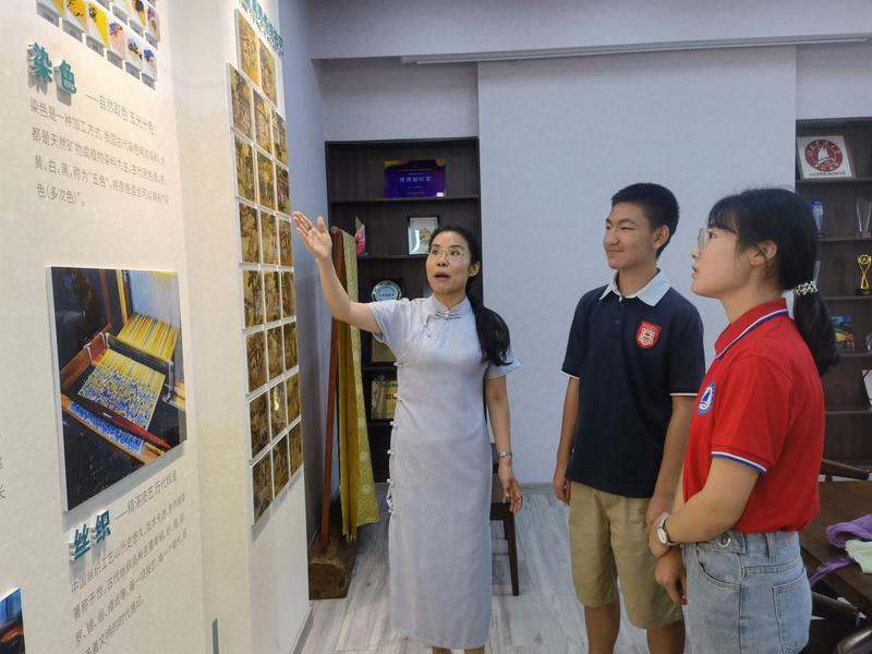 课堂上,指导老师闻燕向同学们介绍了学校中华优秀传统文化传承基地建设情况。据闻老师介绍,“中国传统桑蚕丝织技艺包括栽桑、养蚕、缫丝、染色和丝织等整个过程的生产技艺,以及其间用到的工具、织机和由此生产的绫绢、纱罗、织锦、缂丝等丝绸产品,同时也包括在这一过程中衍生的相关民俗活动。2009年,中国传统桑蚕丝织技艺被列入联合国教科文组织《保护非物质文化遗产公约》人类非物质文化遗产代表作名录。中国传统桑蚕丝织技艺对中国历史做出了重大贡献,并通过丝绸之路对人类文明产生了深远影响。”