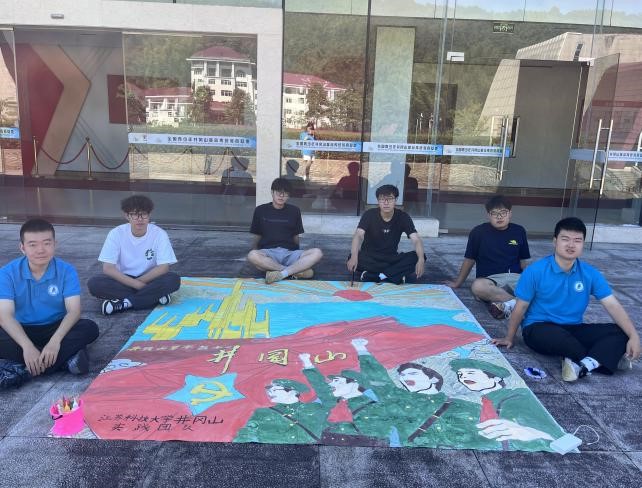 实践团成员们以一种新颖的方式,将革命历史与现代艺术完美融合,合力完成了一幅纳斯卡巨画。同学们还将井冈山红色元素与江科大元素相结合,创作了数件DIY文化衫。